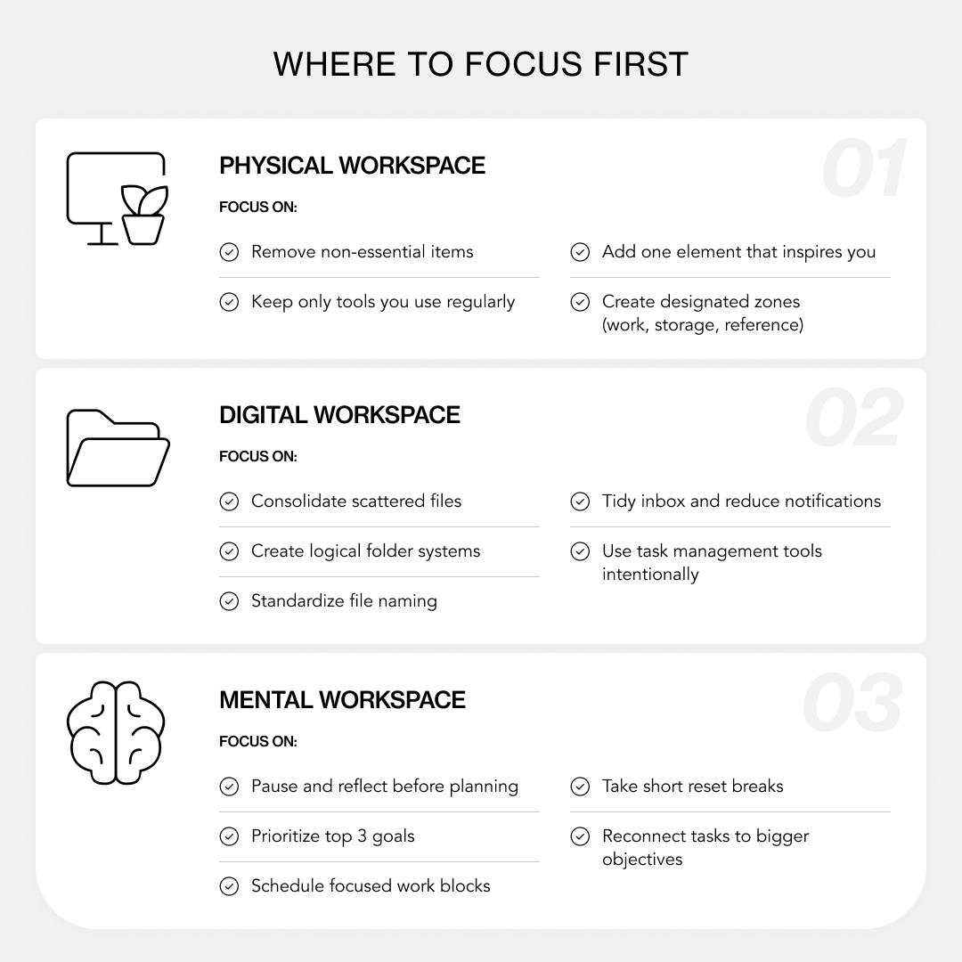Once your physical and digital spaces are streamlined, your mindset naturally follows. Clutter (whether visual or virtual) can quietly drain your energy and make even simple priorities feel overwhelming. Creating order in your environment helps reduce decision fatigue and allows you to approach your work with greater clarity and intention.